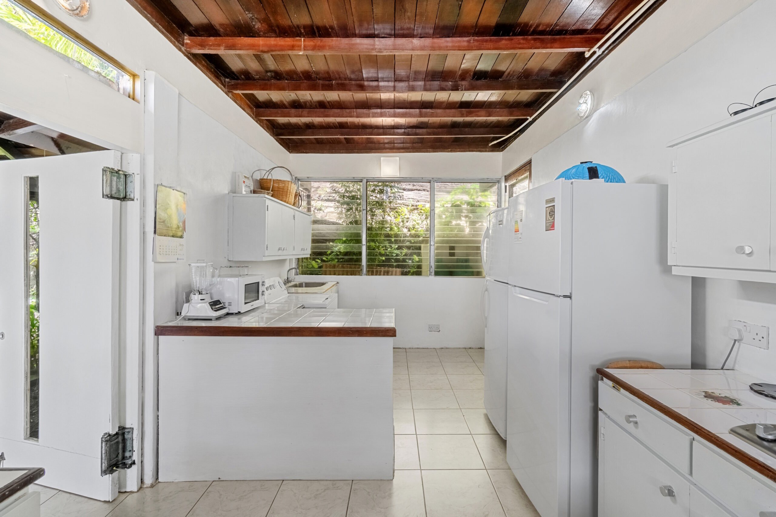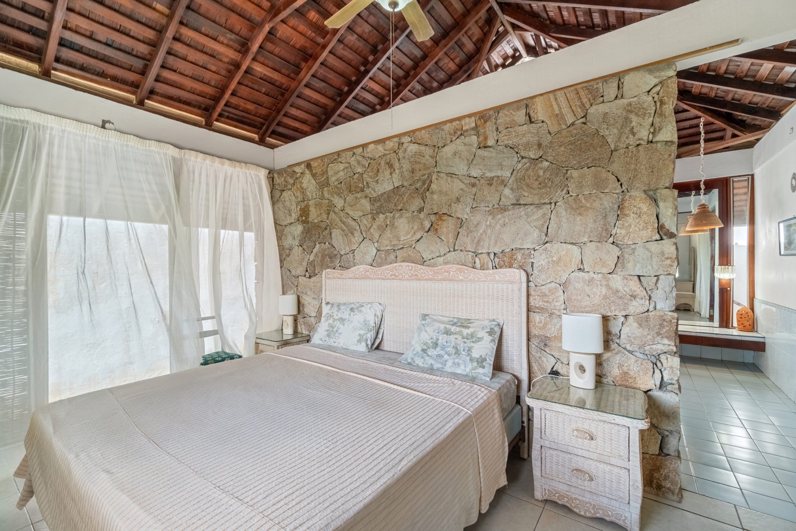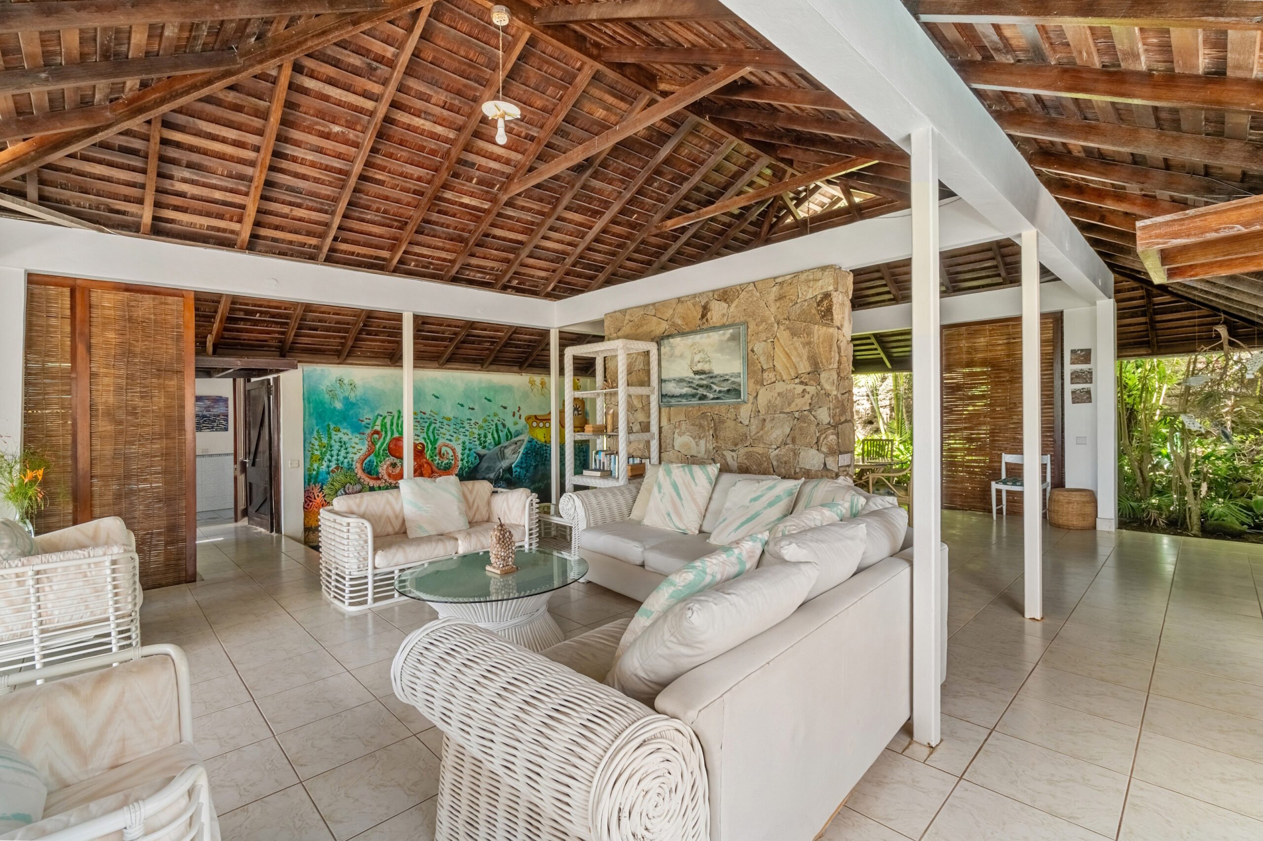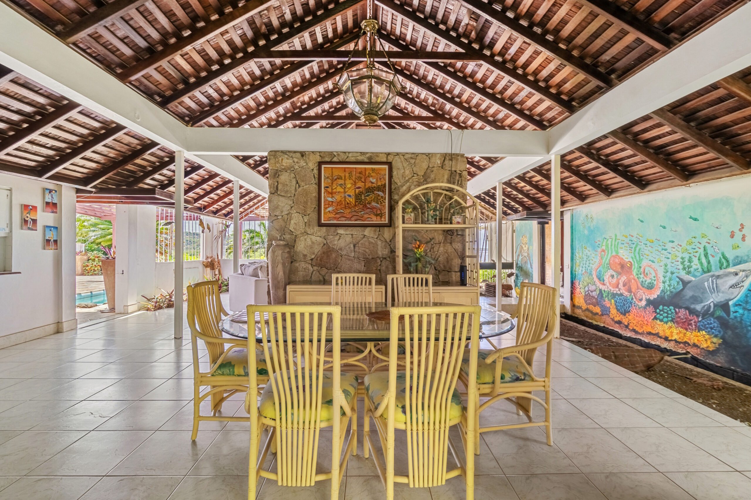 A private plunge pool in the courtyard offers a refreshing retreat on warm Caribbean days, while the cozy outdoor entertainment area provides the perfect setting for evening stargazing with a drink in hand. The garden is lush and well-maintained, with mature, fruit-bearing mango trees adding to the property’s tropical appeal.