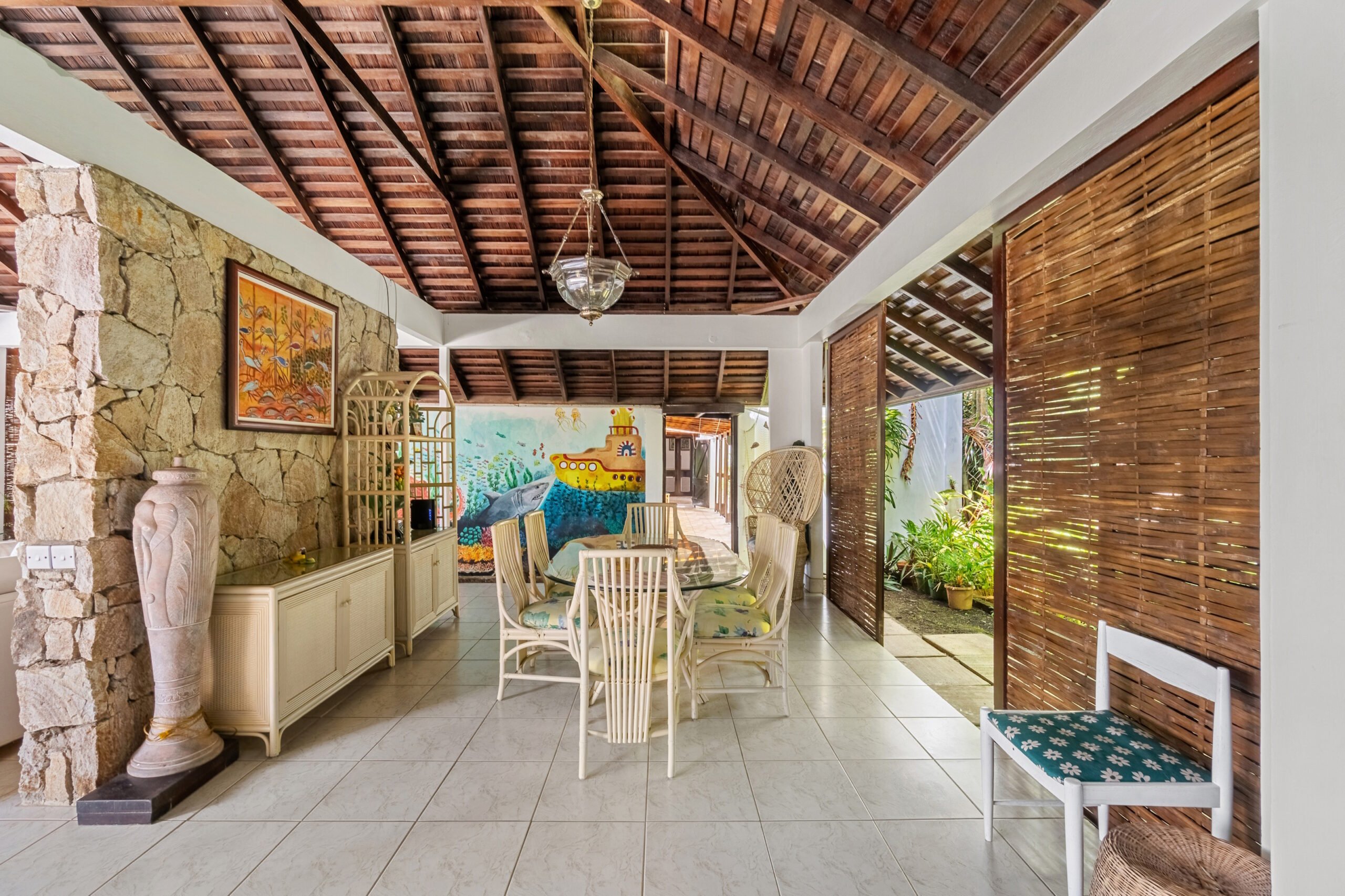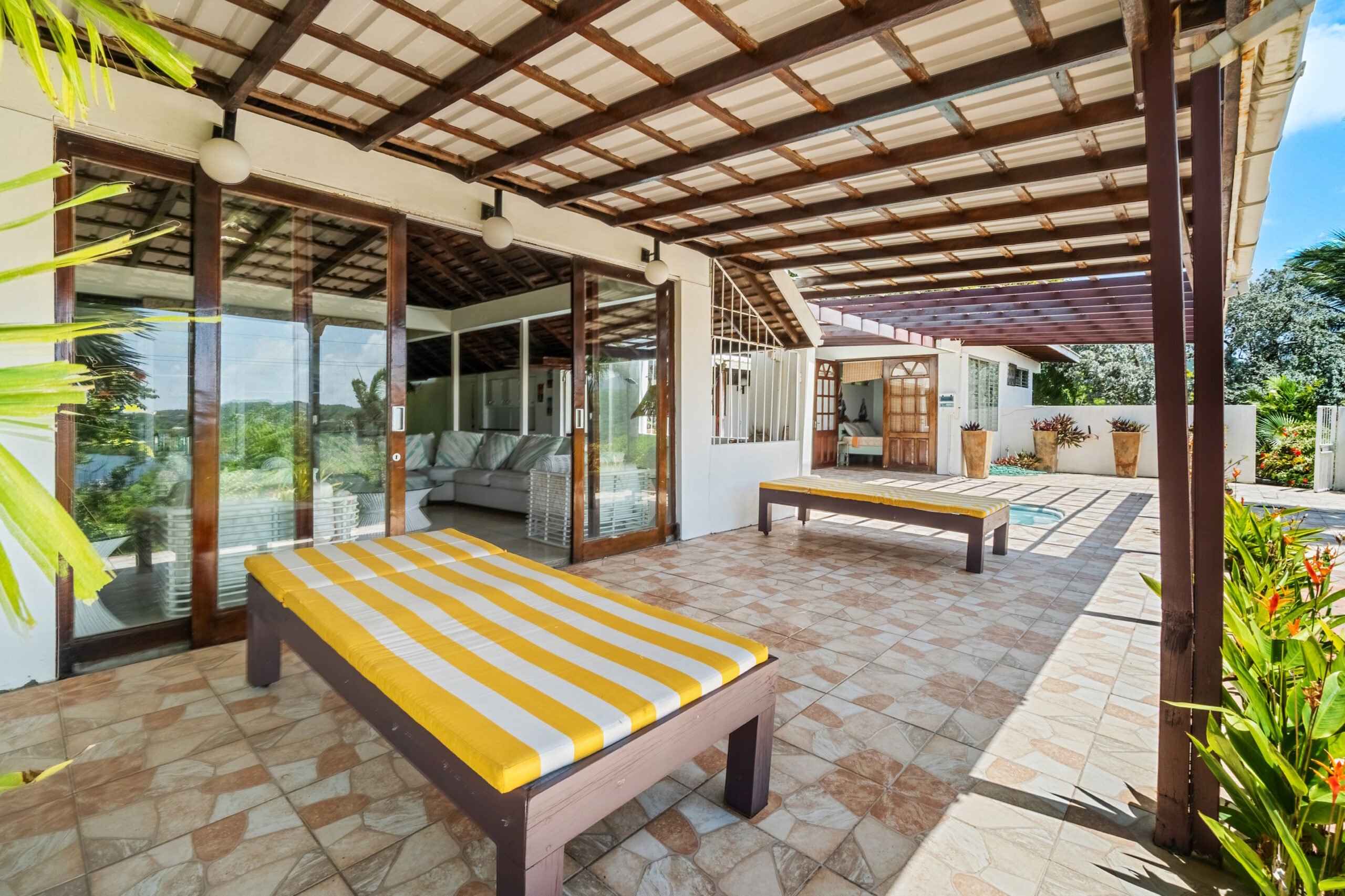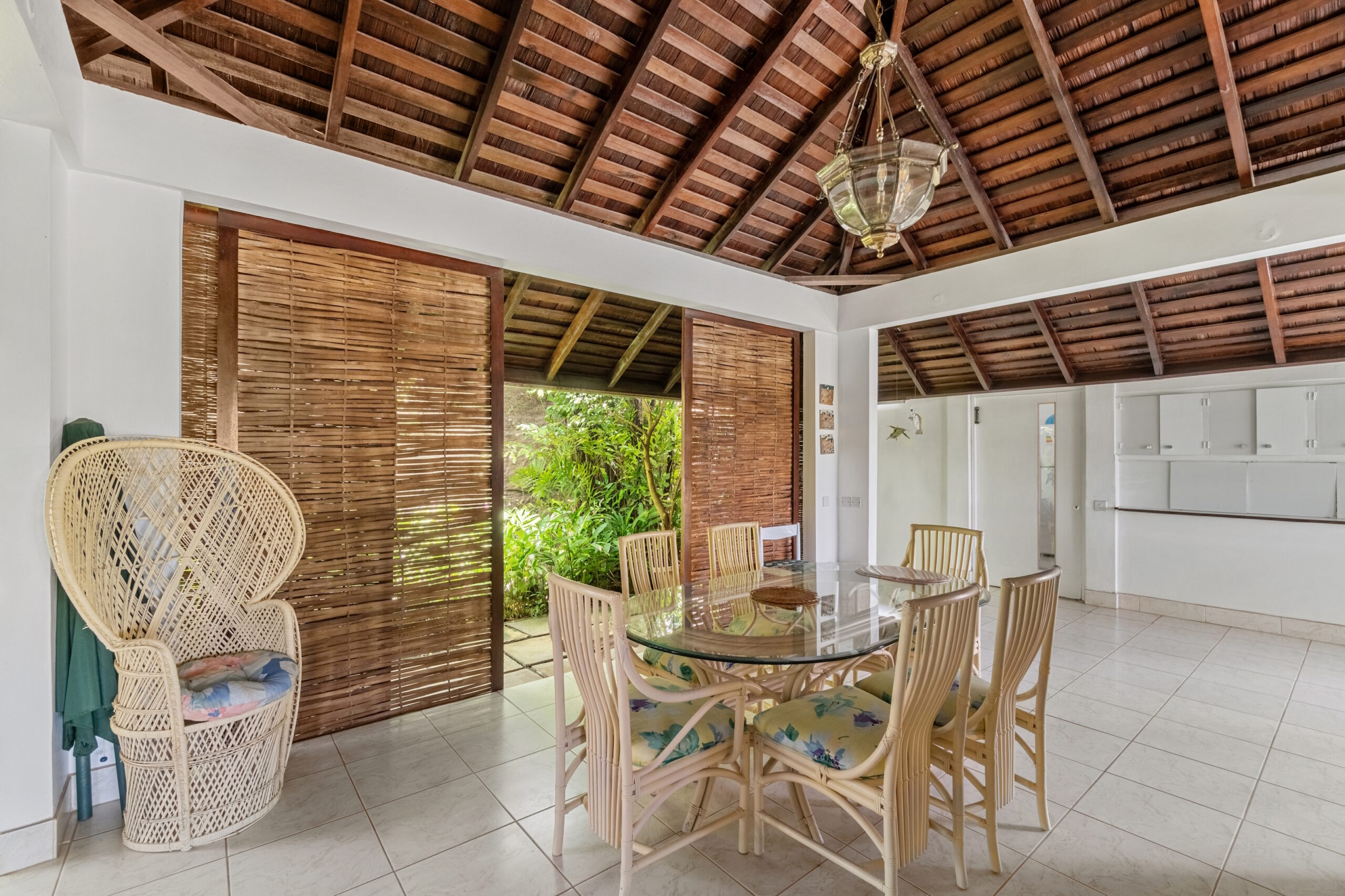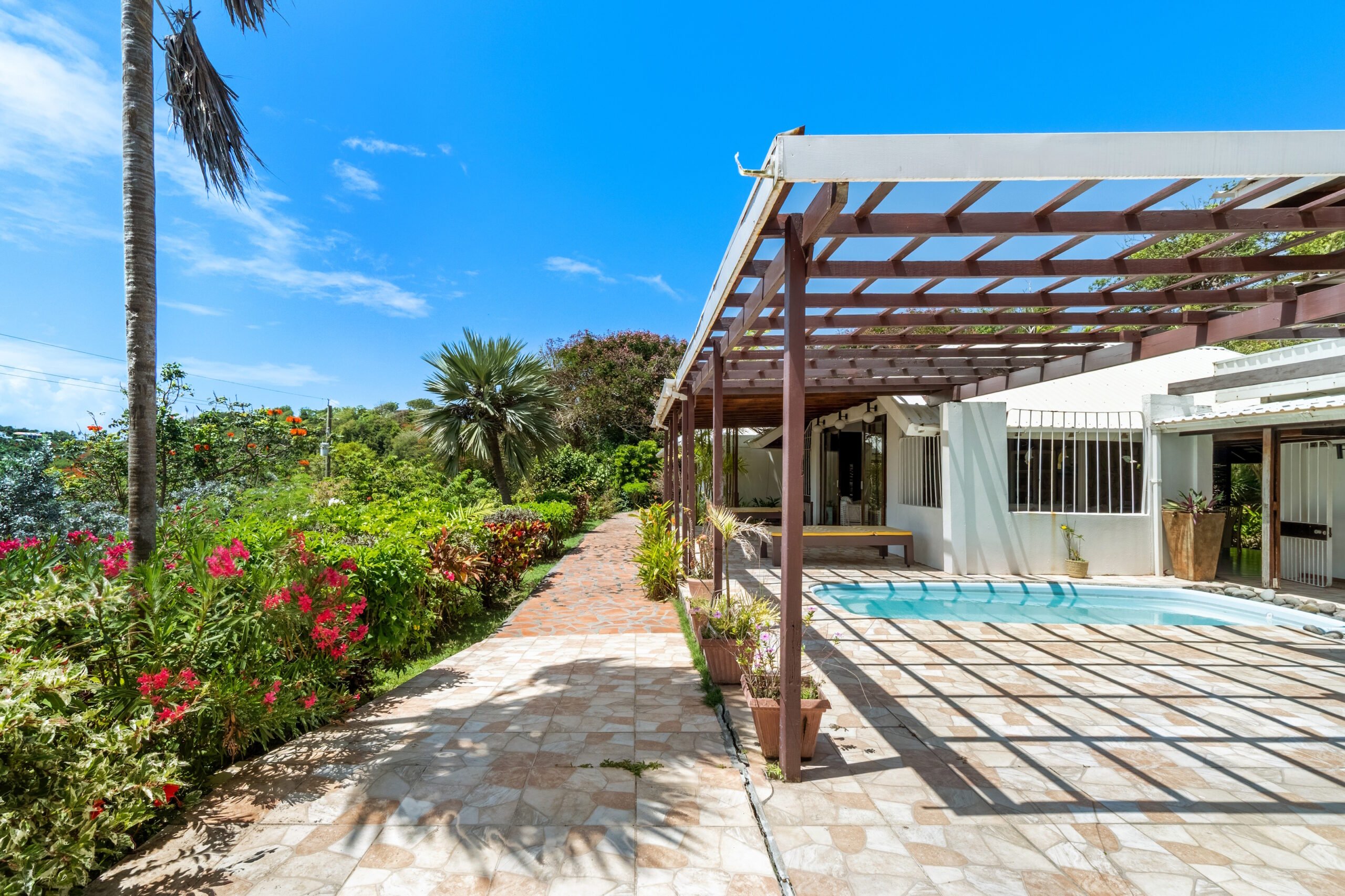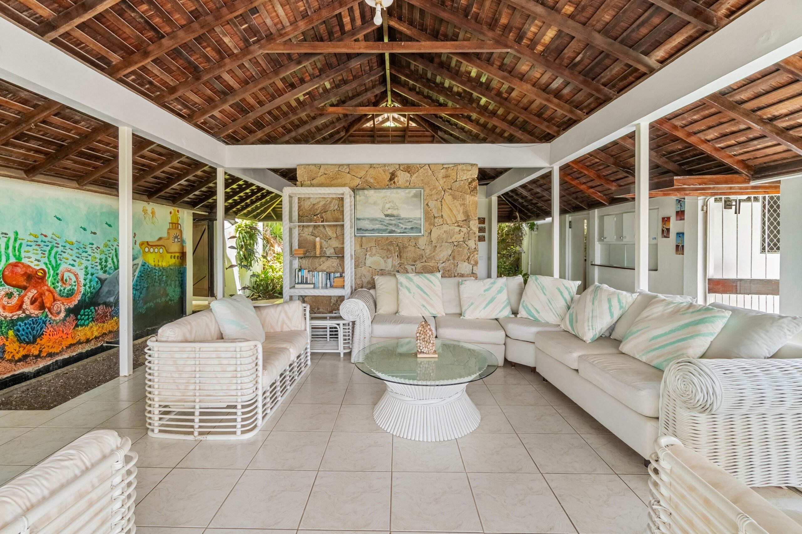 A private plunge pool in the courtyard offers a refreshing retreat on warm Caribbean days, while the cozy outdoor entertainment area provides the perfect setting for evening stargazing with a drink in hand. The garden is lush and well-maintained, with mature, fruit-bearing mango trees adding to the property’s tropical appeal.