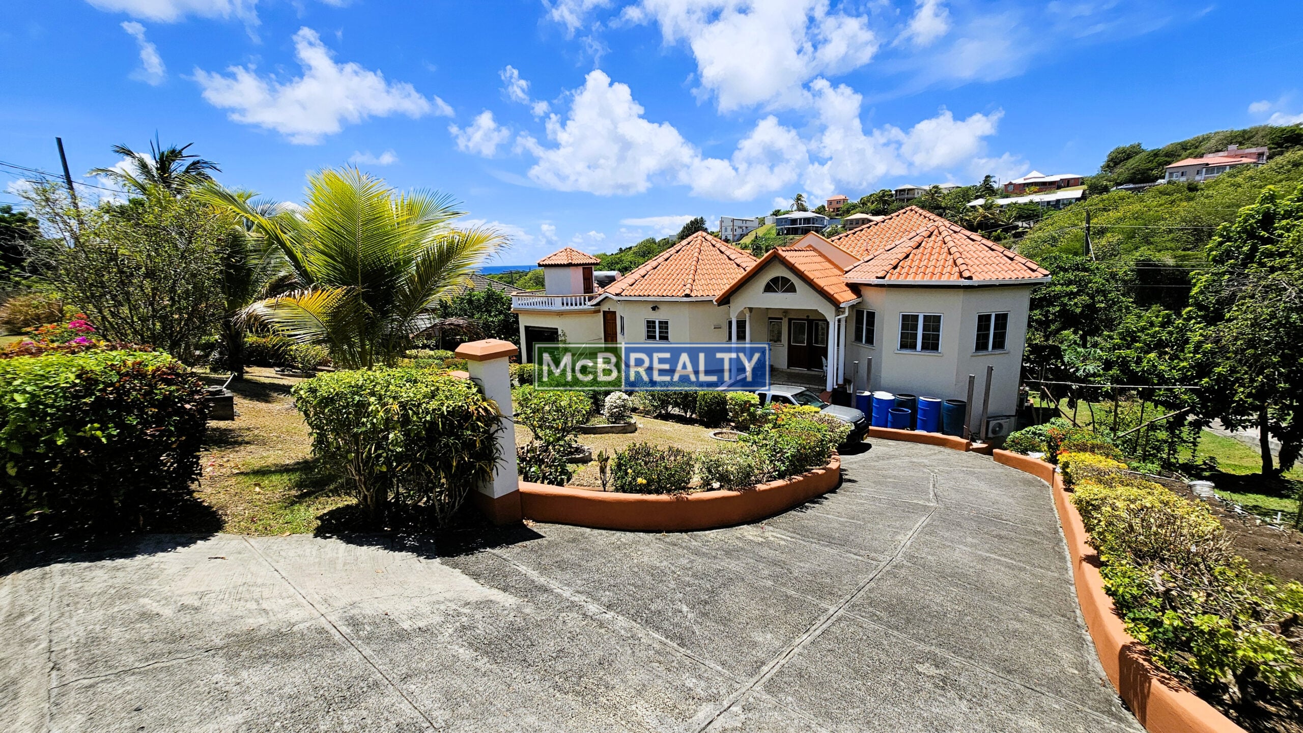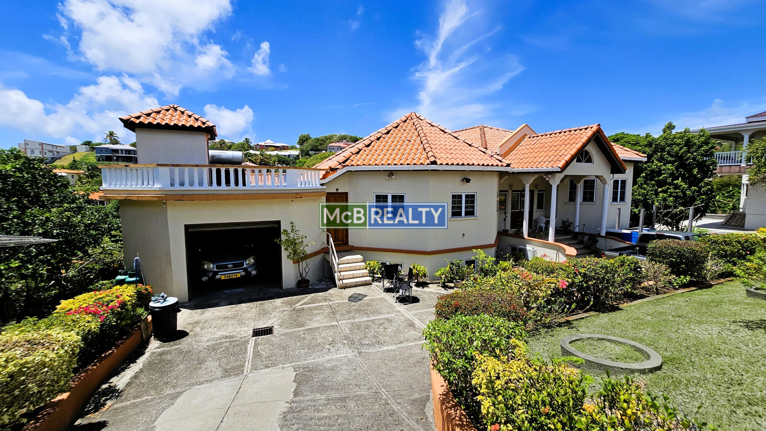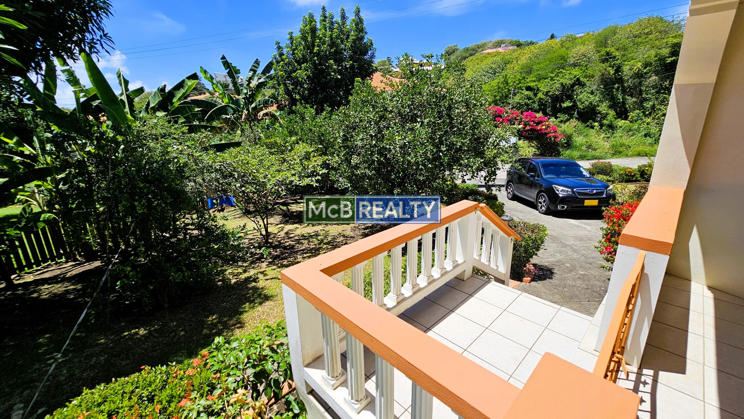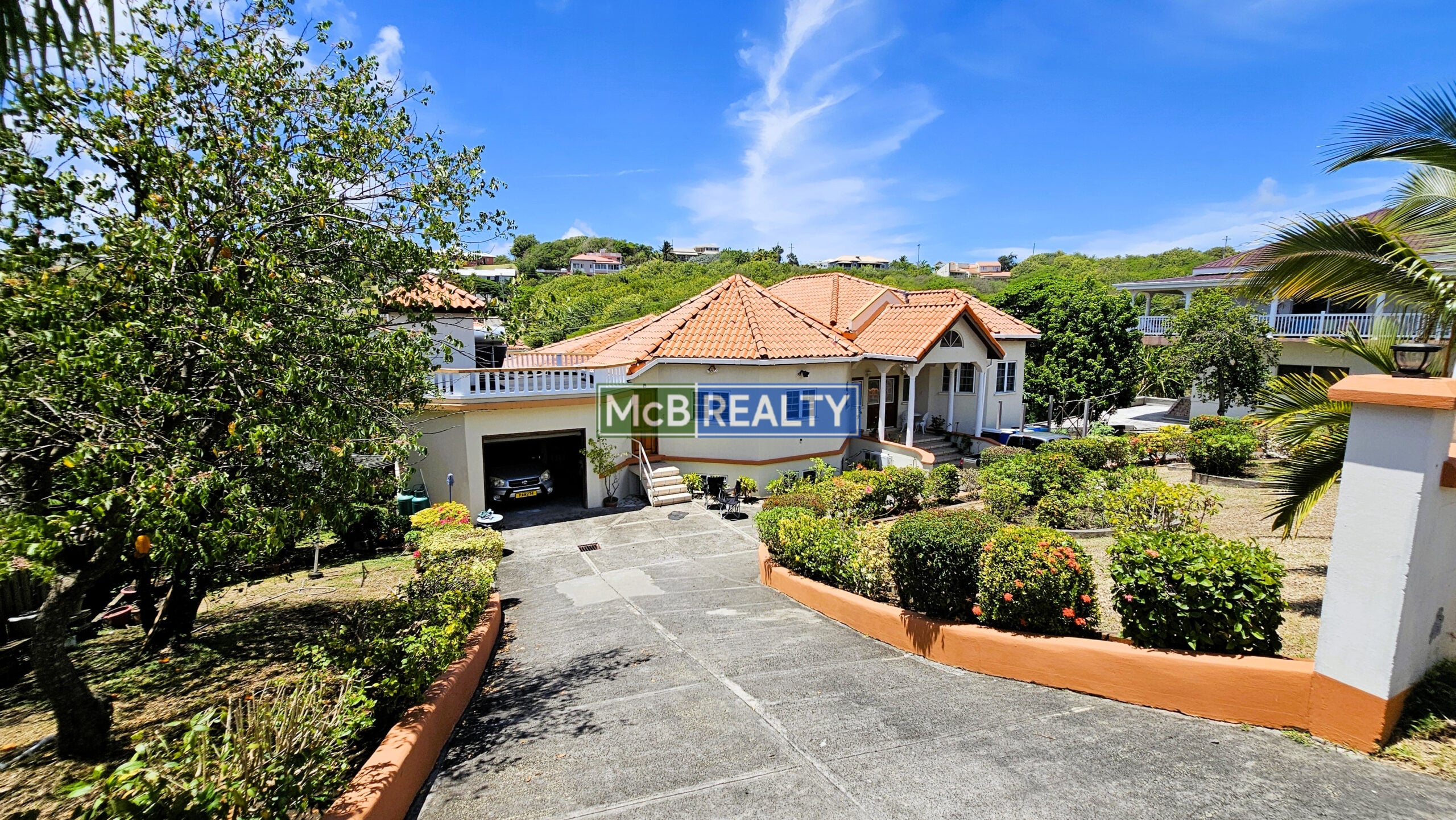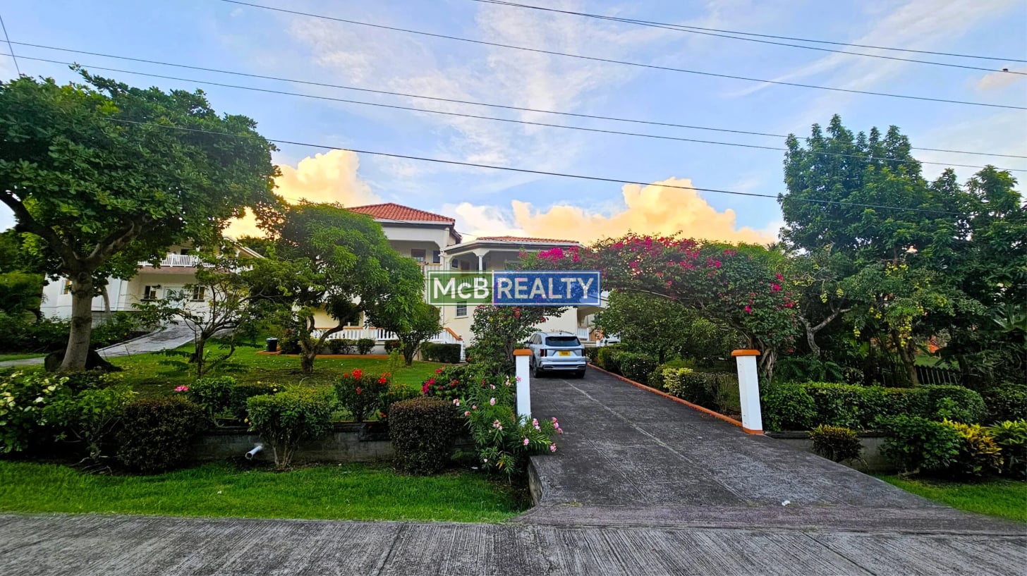 Ascend to your private oasis, accessible via a gated, paved driveway. The upper floor is dedicated to the spacious main residence, featuring an open-concept living, dining, and kitchen area that flows seamlessly onto a rooftop deck—the perfect vantage point to enjoy Grenada’s spectacular sunsets over the sea. The layout includes a master suite with a walk-in closet and an ensuite bathroom, plus two additional bedrooms, each with its own ensuite. A garage, laundry room, and two powder rooms complete this elegant living space.